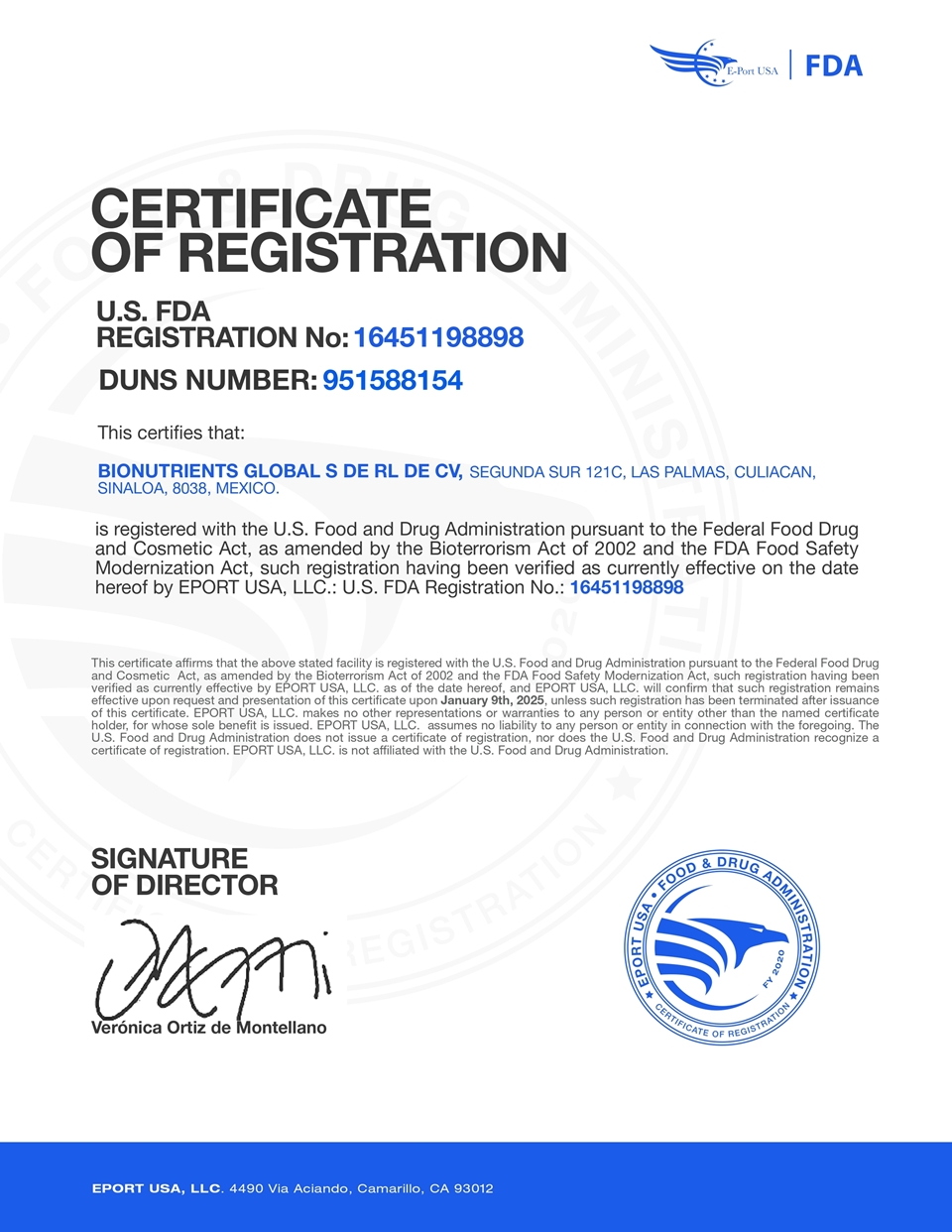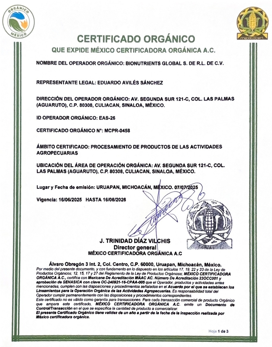 En BioNutrients Global®, nuestros procesos y productos están respaldados por certificaciones de clase mundial, lo que garantiza calidad, seguridad y cumplimiento normativo en cada etapa de producción. Contamos con certificaciones reconocidas internacionalmente, como FDA (USA), HACCP, Orgánica Mexicana (SAGARPA), Amazon Verified Facility, ISO 9001, así como certificaciones privadas de alto prestigio, como las de Kellogg’s.